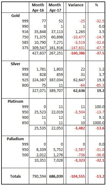 Hallmarking figures for the month of April has shown a 13.2% decrease when compared to the same period last year.