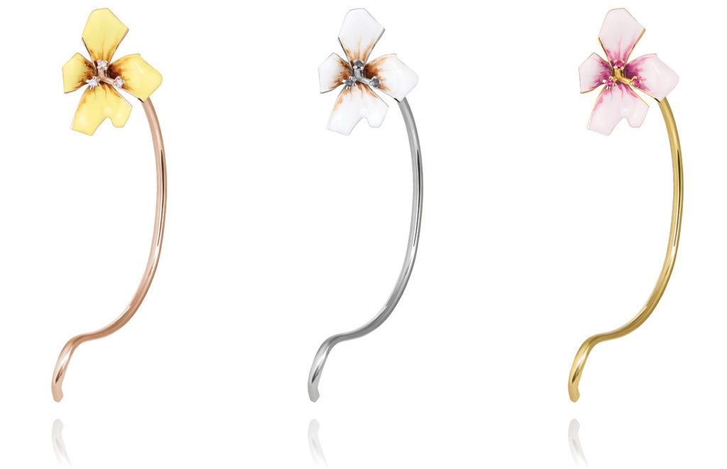 The Wild Flowers range focuses on the ear with floral pieces. The range includes ear cuffs, studs, stiletto earrings and interchangeable dewdrop earrings.