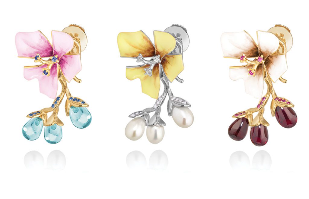 The collection is made of 18 carat gold in yellow, white and rose, garnets, smoky quartz, diamonds, sapphires and hand-painted enamels. Prices range from £615 to £1945 depending on materials used.