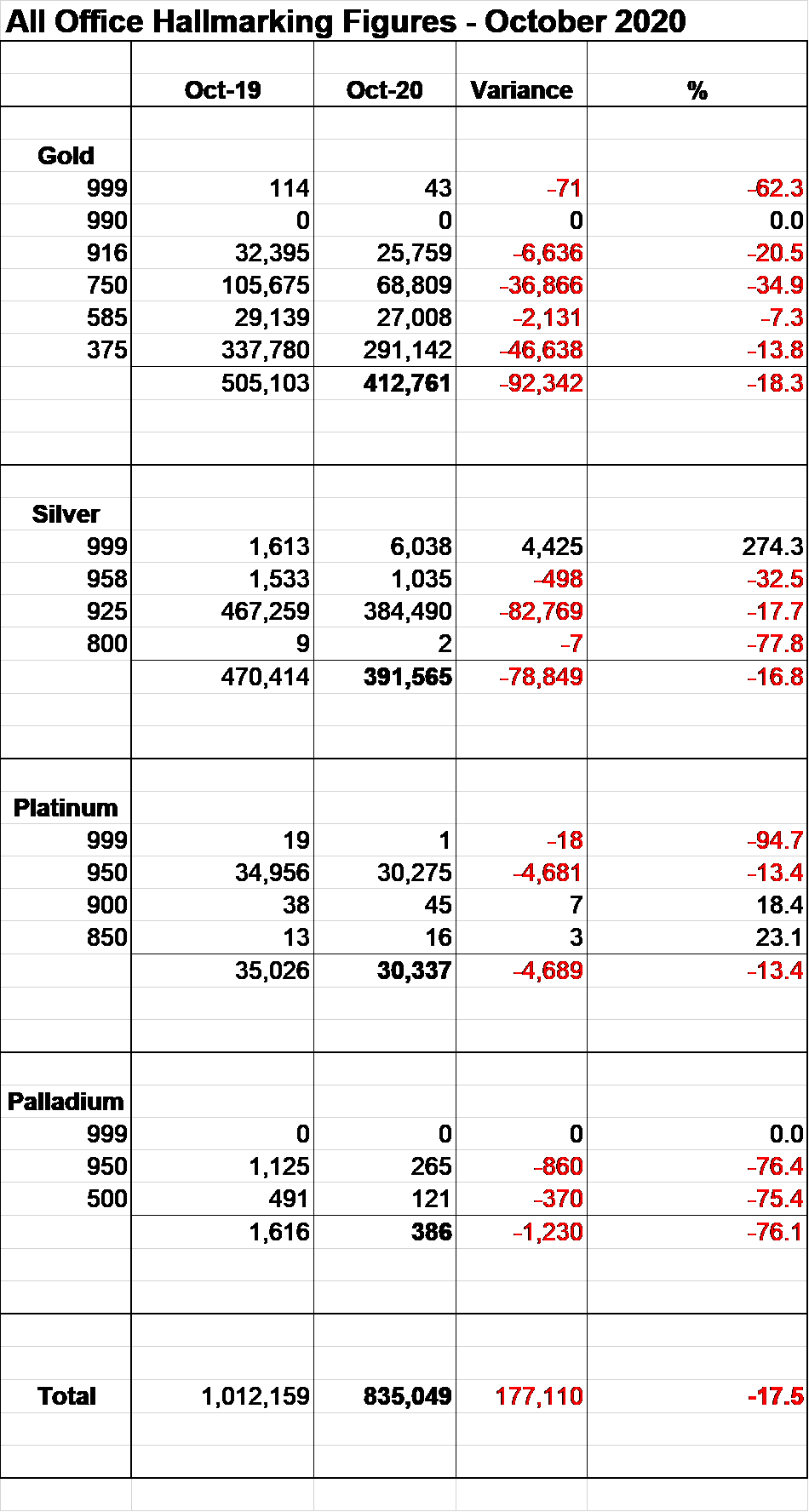 This marked a total improvement against September’s figures, where total hallmarking was down by 19.5% against the prior year.